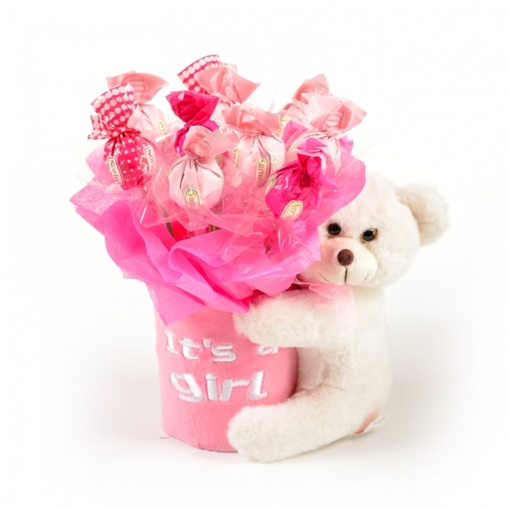 זר שוקולד מתוק במיוחד שזור בקפידה ובמקוריות רבה בשילוב כלי דקורטיבי המחובק באהבה רבה על ידי דובי לבנבן וטהור ובשילוב כיתוב הכרזה: "It's A Boy/Girl"